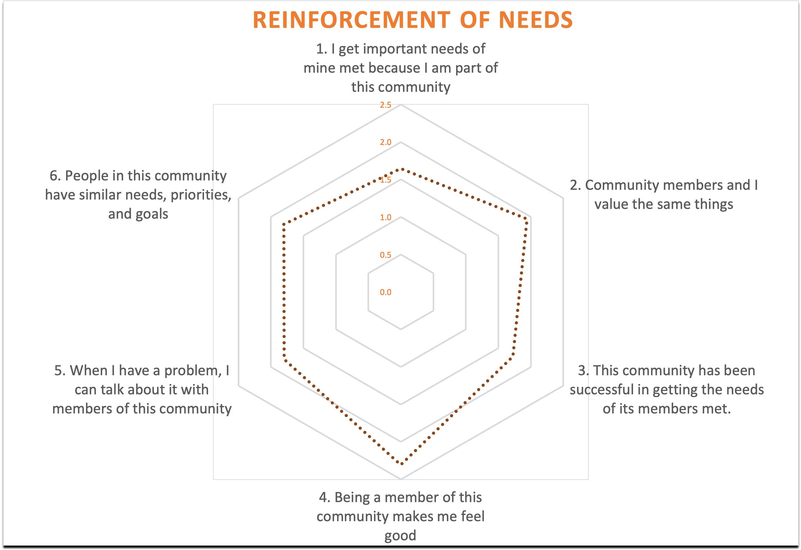 The first set of questions is on “reinforcement of needs.” The lowest score is for “I get important needs of mine met because I am part of this community” – and maybe this isn’t surprising because I’m not sure I know my member’s needs. I’ve asked what being a member helps them accomplish, but this is different from their needs.